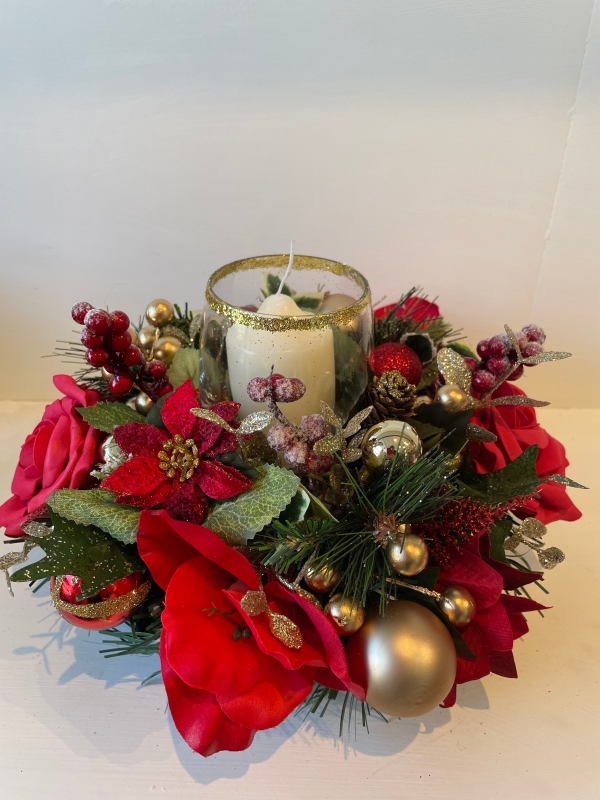 Elegant Glass Candle Table Arrangements dressed in Christmas attire to make your Christmas table even more beautiful