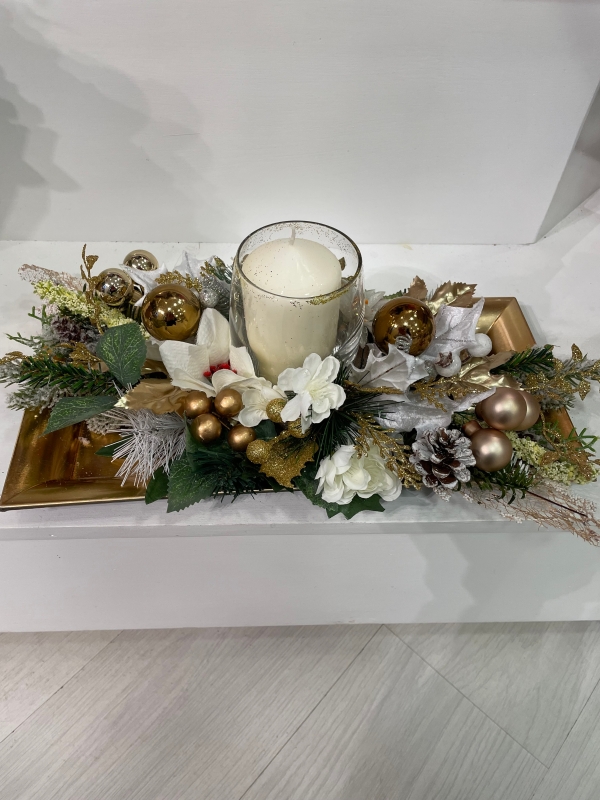 This elegant table arrangement can be created in many colours.  The traditional Christmas Arrangement in red & gold is the most popular.
